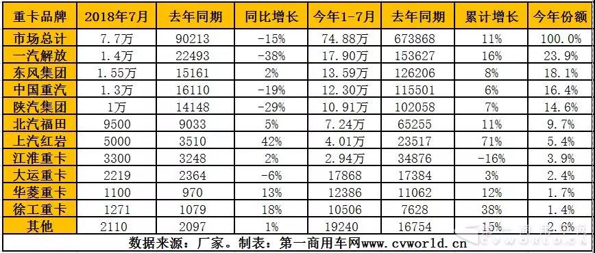 2018年1-7月重卡市場企業(yè)銷量一覽表(單位:輛)